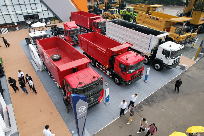 山东重工集团此次展出的核心产品均针对印尼及东南亚市场的特殊需求深度优化,集中展出了动力总成、挖掘机、装载机、推土机、平地机、压路机、自卸车、牵引车等在内的多款前沿产品。其中潍柴动力总成凭借响应更快、动力更强的优势,成为大马力机械设备的重要动力来源;山推、雷沃重工展出了配备挖掘机动力总成的百吨级矿用挖掘机SE1500LCW和FR2000F,与中国重汽和陕重汽矿卡、自卸车组合,成为大马力采装区的绝对主角。