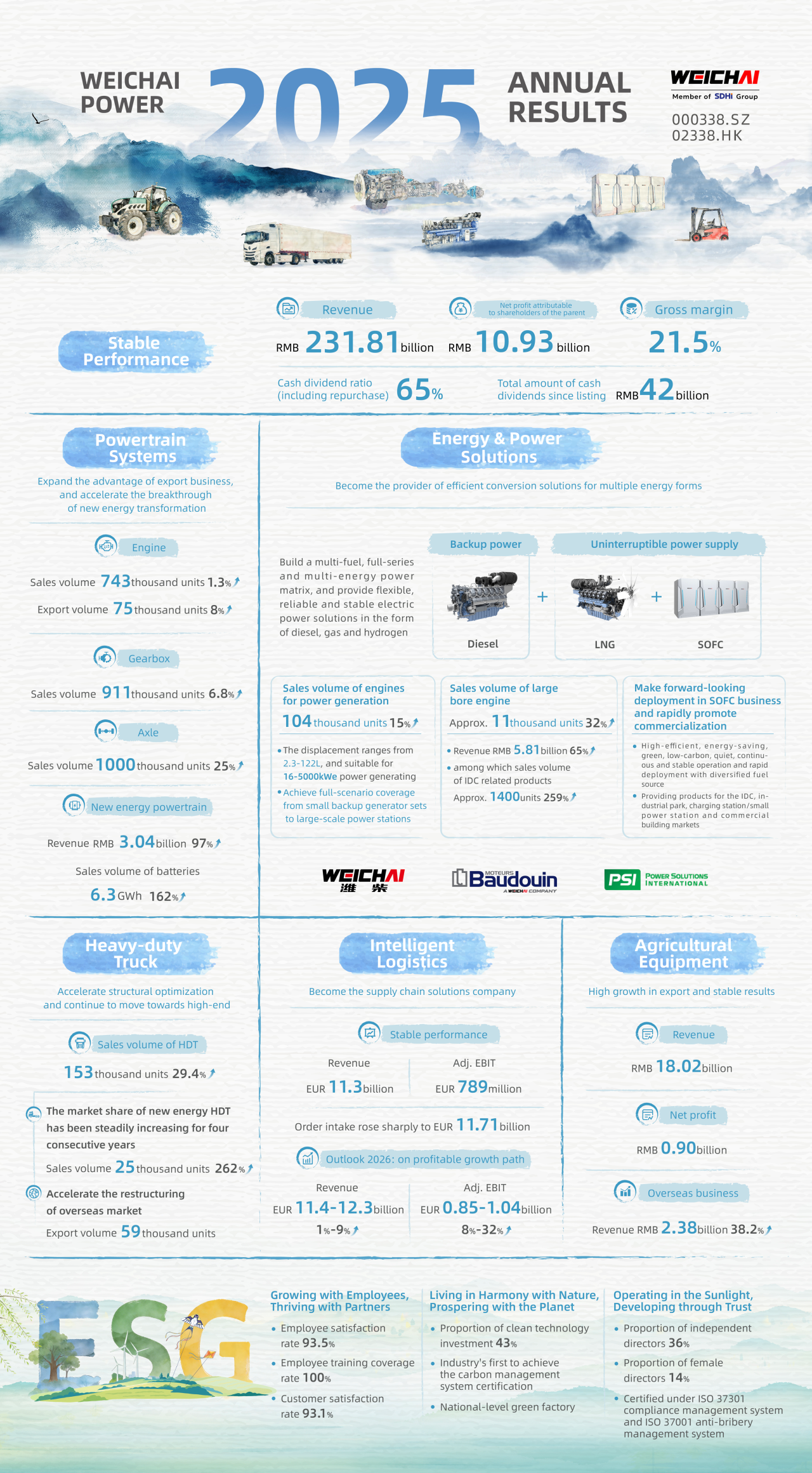 3月26日晚间,潍柴动力披露2025年年度报告。报告期内,公司实现营业收入2318亿元,同比增长7 5%;归母净利润109亿元。基于稳健经营业绩,公