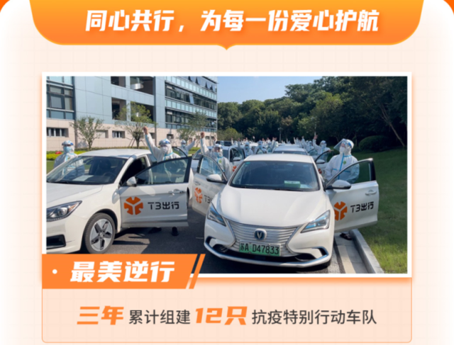 一方面,面对突入而来的新冠肺炎疫情,T3出行迅速在武汉、南京、长春、成都、重庆、苏州、天津、济南、青岛、海口等城市组建了12支抗疫特别行动车队,召集志愿者司机共计1200多名,累计免费服务超260个社区共50万人次疫情期间出行需求。