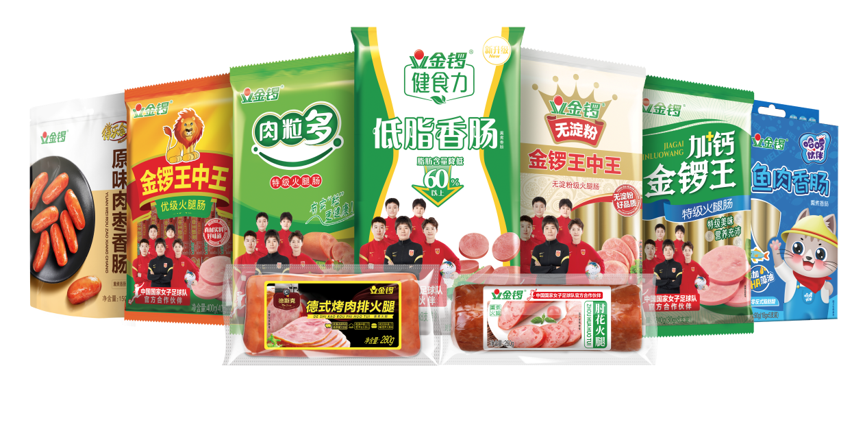 目前,金锣高低温肉制品由原来单一的猪肉火腿肠逐步发展为鸡肉肠、牛肉肠、鱼肉肠等11大系列40多个品种,600多个规格。其中,耳熟能详的明星品牌有中温突破型产品“肉粒多”、高温换代型产品“无淀粉王中王”、德式低温产品“德斯克”、健康创新产品“健食力”、儿童香肠品牌“哈啰伙伴”、家庭餐饮肉制品品牌“好厨易”等。就产品而言,金锣立足“一切为了人类健康”的核心价值观,围绕多元产品线已经结出累累硕果。