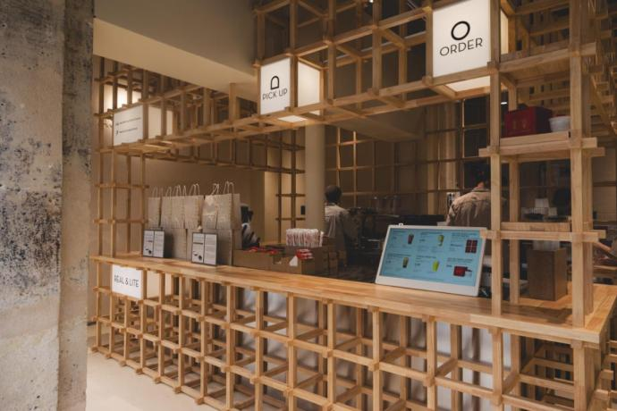 呼应茶室这一极具东方韵味的空间概念,喜茶巴黎观赛茶室整体由纵横交错的木质结构和暖黄色的灯箱搭建组成。富有禅意的极简造型与温暖的光线,在巴黎营造出东方式的宜古宜今饮茶空间。消费者可以错落入座,观赛饮茶,感受在其中流淌的清新茶香与友好的交流氛围。