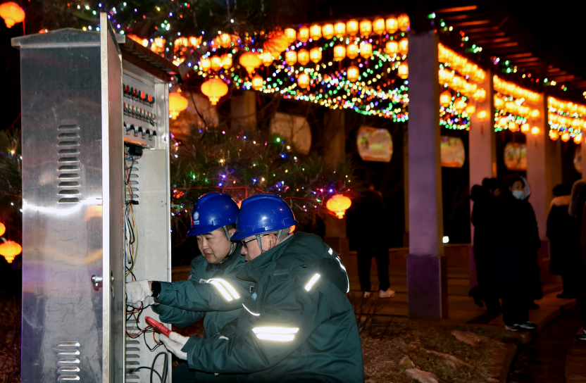 除夕(1月28日)夜,国网威海市文登区供电公司员工在文山公园灯光观赏区检查配电线路设备。