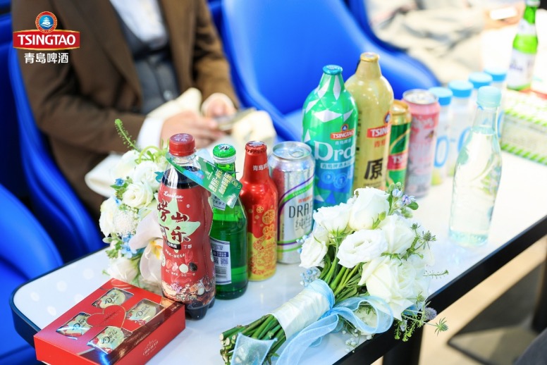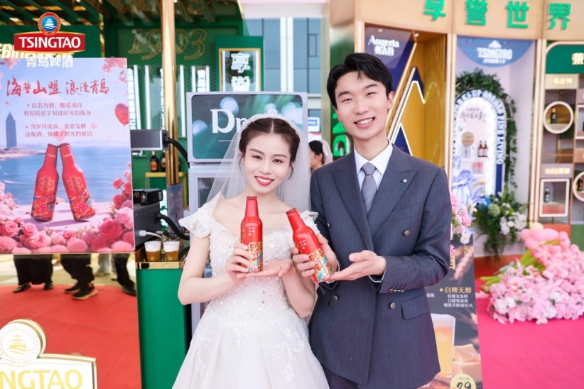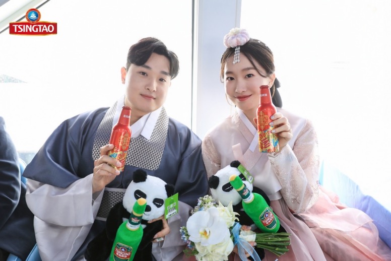 在参加婚礼的20对新人中,来自韩国的朱康敏和孙智源是唯一一对来自国外的情侣,两人相识于北京,定居在青岛。拿着青岛啤酒为婚礼制作的定制酒,朱康敏和孙智源感到十分兴奋。“我从初中就和父母来到青岛,深深地爱上了这座城市的啤酒文化,没想到在婚礼现场还能收到青岛啤酒的专属定制酒,我和妻子觉得特别有意义,我们计划定居在这座城市,携手开启美好新生活。”朱康敏说。