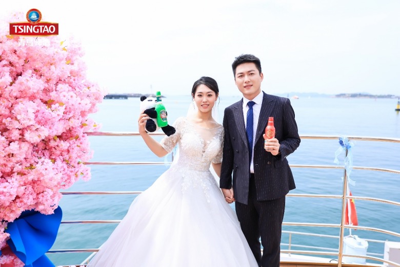 在这个特殊的日子,拿着可有自己名字的青岛啤酒专属定制酒,新人们都感到十分兴奋。当满载着新人的游艇行驶在浮山湾,新人们以青岛美丽的天际线为背景,为爱干杯!为美好生活干杯!
