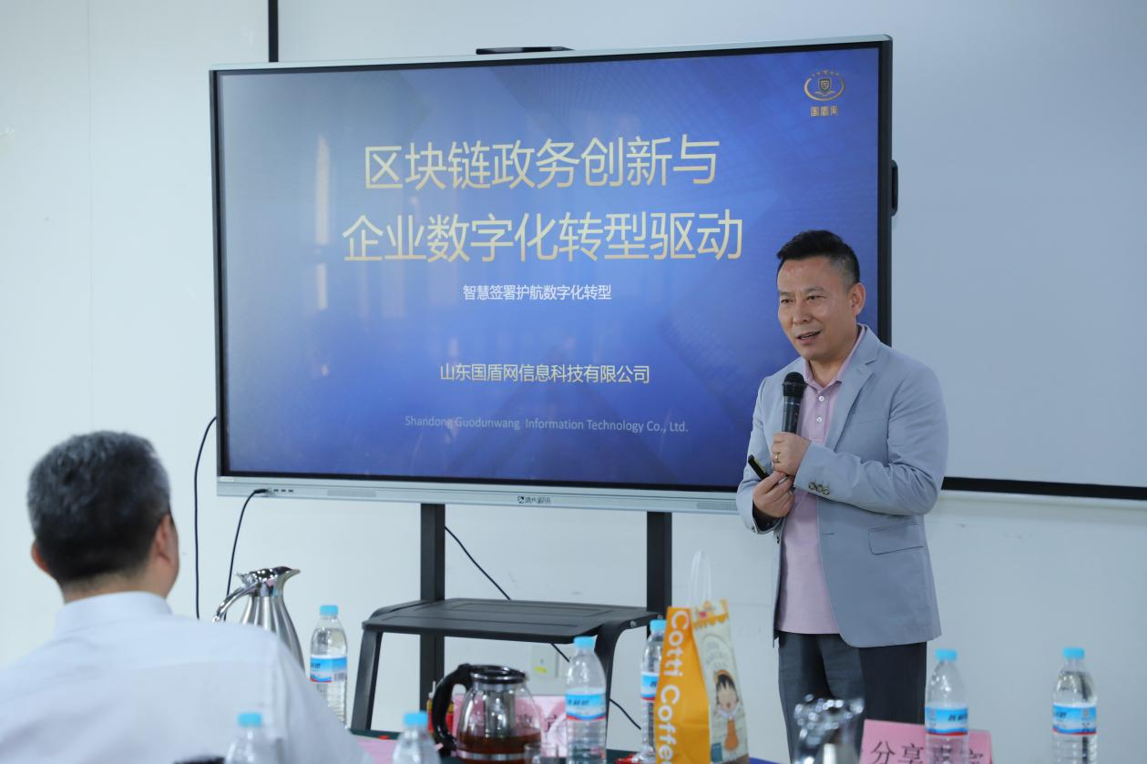 副会长单位山东国盾网董事长马宇阐述区块链技术驱动政务创新与企业数字化转型。