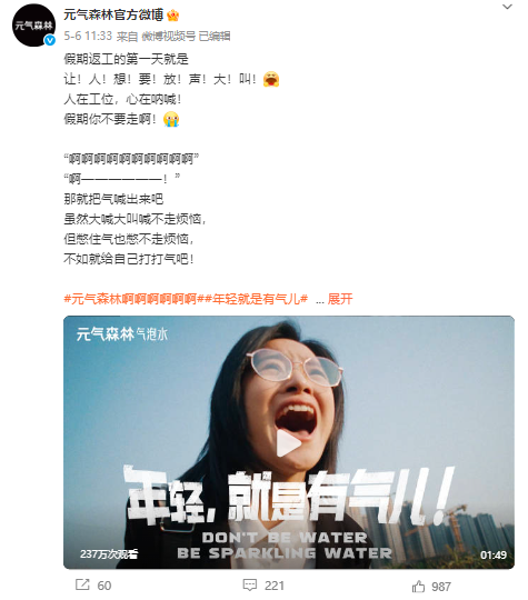 今年五四青年节,一支名为《年轻,就是有气儿》的品牌短片在社交媒体掀起风暴。上线之后播放量迅速突破200万次,相关话题#年轻就是要有气儿#、#年轻就要这股气#等引发热议。短片中,元气森林将气泡水的“气体冲击感”升维为精神符号,把年轻人面对压力时的“不服输、不憋屈”具象化为瓶身迸发的气泡,用一句“大喊大叫叫不走烦恼,给自己打气没什么不好”精准击中Z世代的情绪G点。