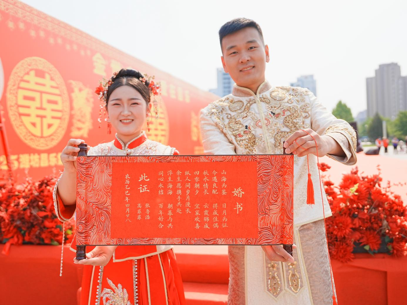 本次活动由昌乐县民政局主办、梦金园黄金珠宝集团股份有限公司承办,旨在深化移风易俗改革,倡导婚事简办、抵制高额彩礼。集体婚礼上新人们首先签订《婚事简办倡议书》,并在“抵制高额彩礼、拒绝低俗婚闹”的横幅上郑重签名,彰显对文明婚俗的坚定支持。