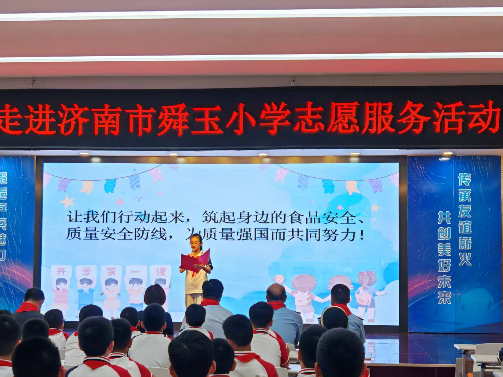 活动在庄严而温馨的氛围中拉开帷幕,少先队员代表为参会人员佩戴红领巾,表达同学们最纯真的敬意。随后,学生代表宣读了食品与质量安全消费倡议,呼吁大家关注食品安全、重视质量安全,争做理性、文明的消费者。