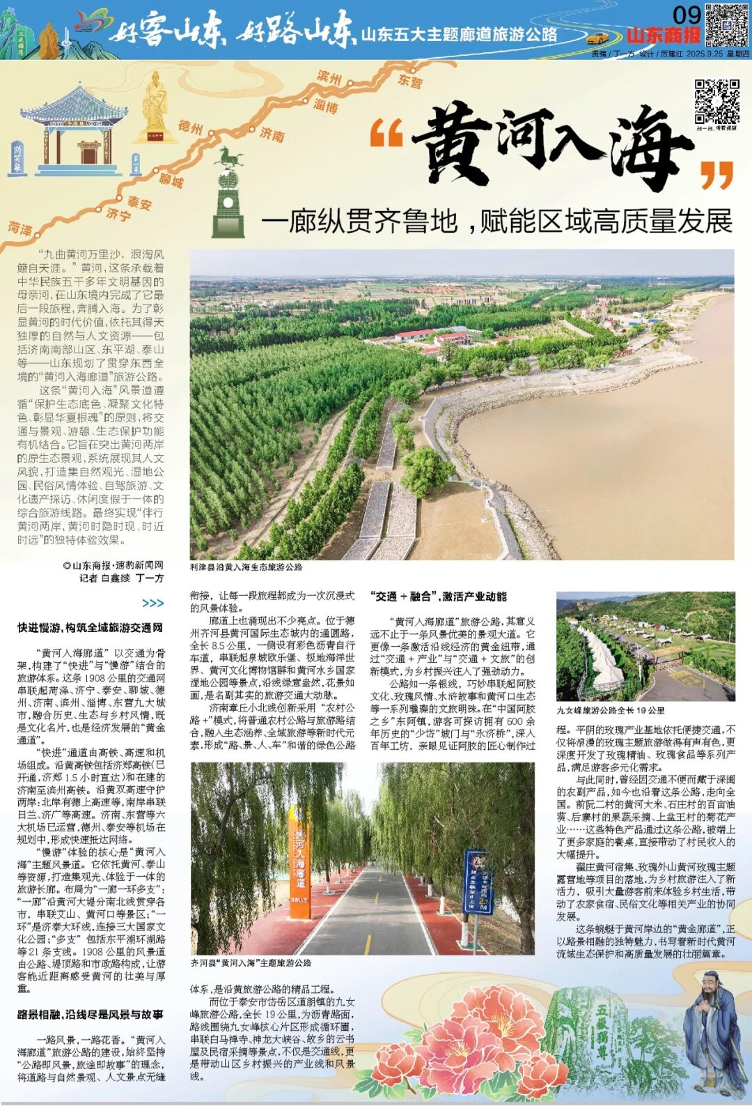 “黄河入海廊道”以交通为骨架,构建了“快进”与“慢游”结合的旅游体系。这条1908公里的交通网串联起菏泽、济宁、泰安、聊城、德州、济南、滨州、淄博、东营九大城市,融合历史、生态与乡村风情,既是文化名片,也是经济发展的“黄金通道”。