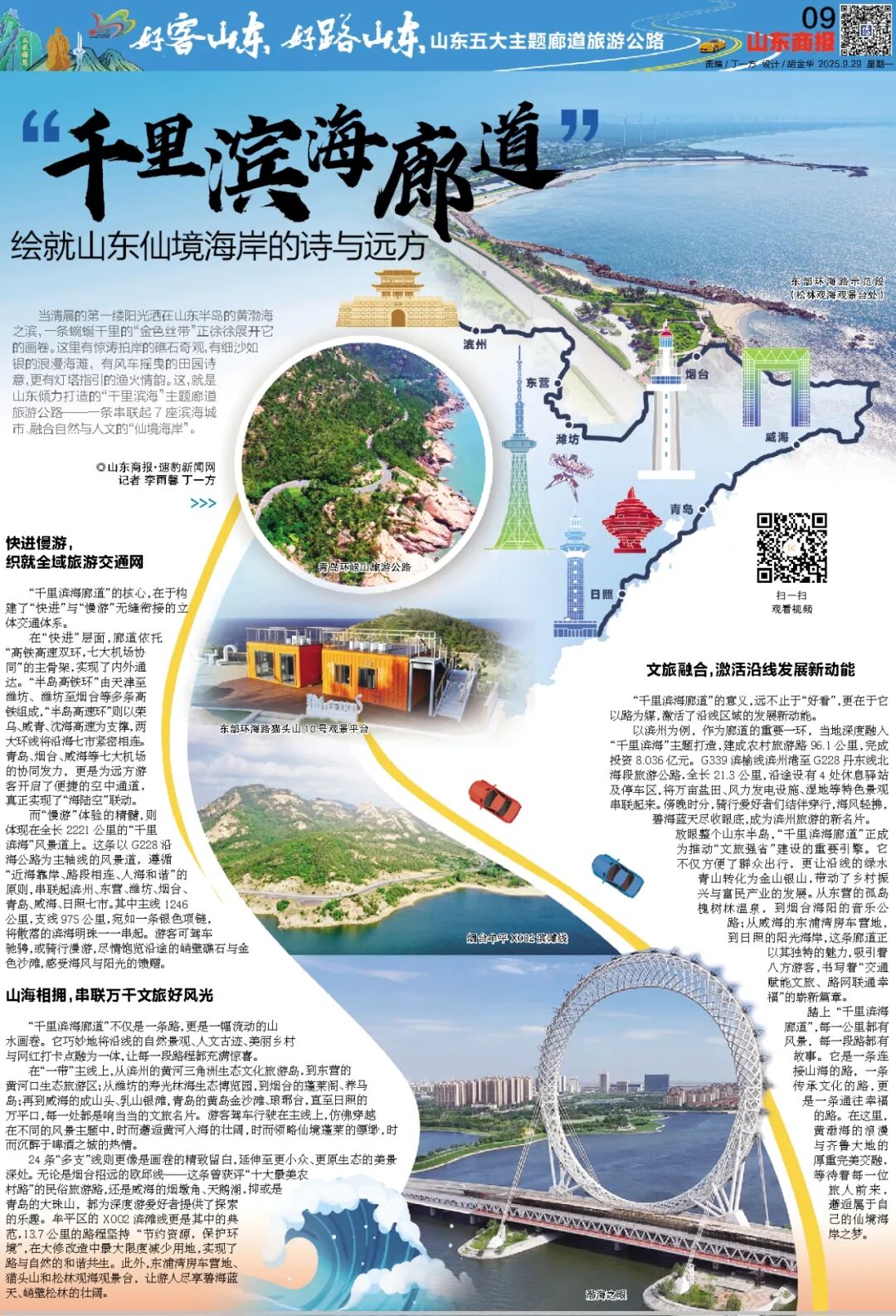当清晨的第一缕阳光洒在山东半岛的黄渤海之滨,一条蜿蜒千里的“金色丝带”正徐徐展开它的画卷。这里有惊涛拍岸的礁石奇观,有细沙如银的浪漫海滩,有风车摇曳的田园诗意,更有灯塔指引的渔火情韵。这,就是山东倾力打造的“千里滨海”主题廊道旅游公路——一条串联起7座滨海城市、融合自然与人文的“仙境海岸”。