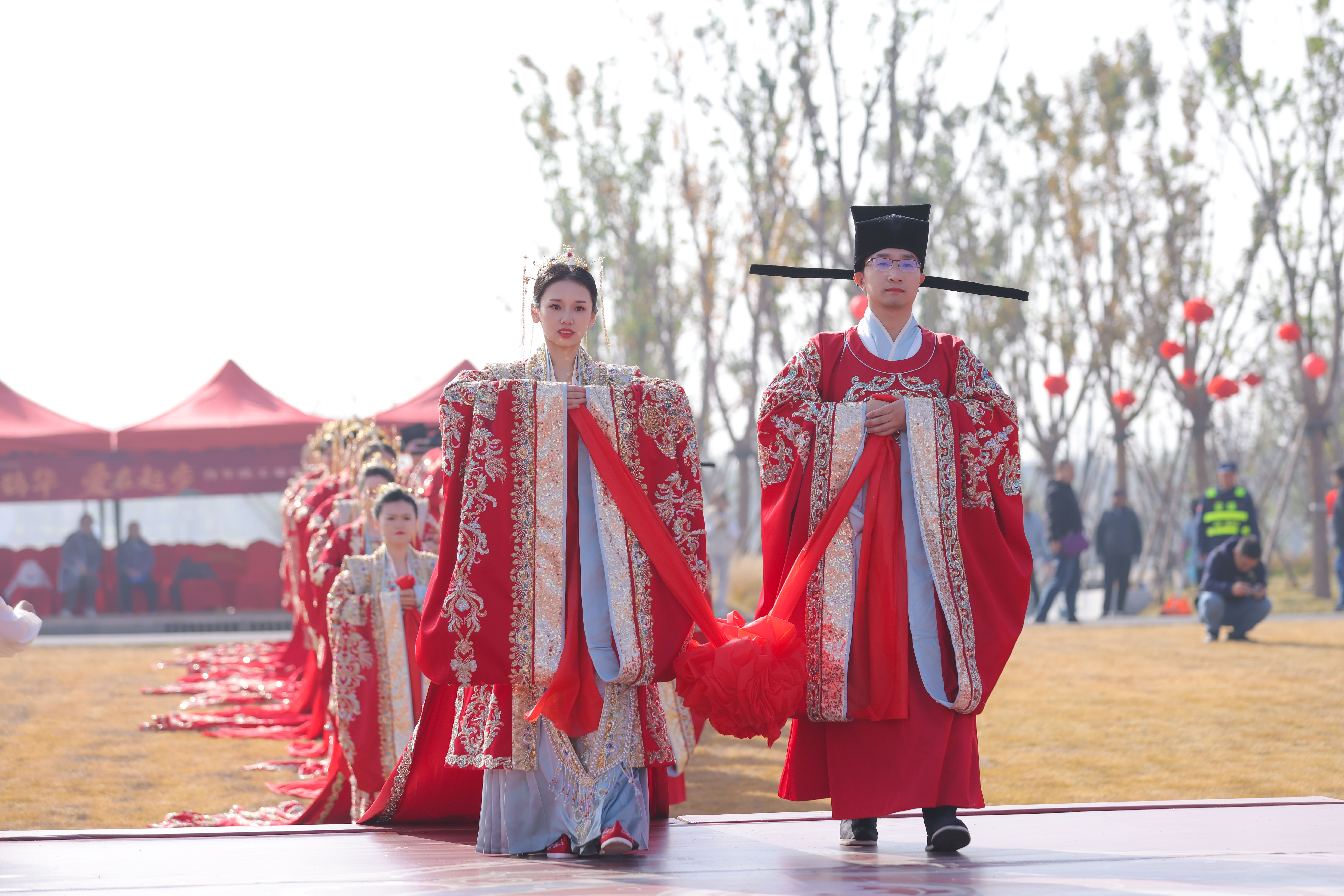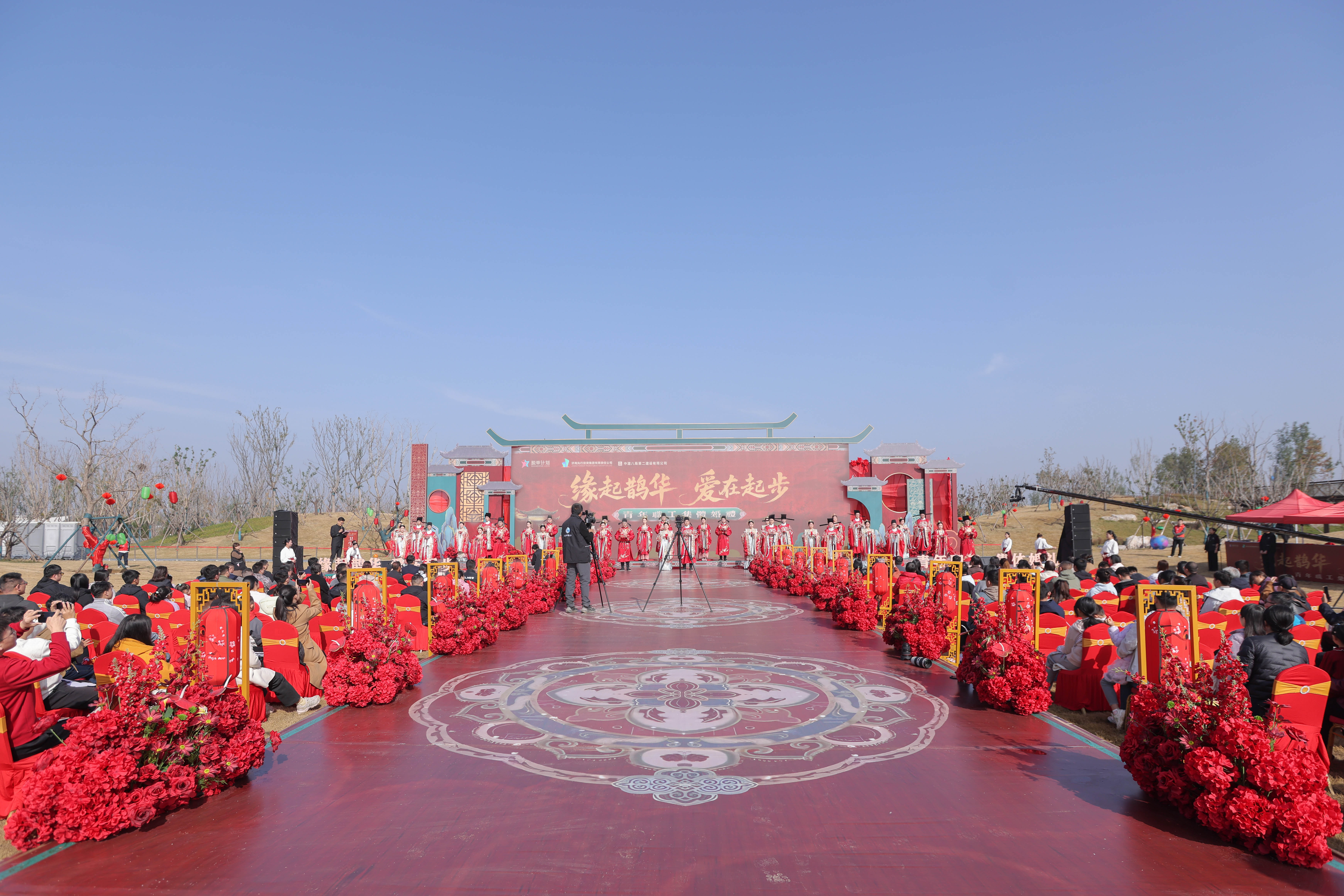 为弘扬文明婚俗,凝聚青年力量,11月9日,“缘起鹊华 爱在起步”青年职工集体婚礼在济南新旧动能转换起步区鹊山生态文化区动感草坪温馨举办,来自济南先投集团、中建八局二公司的18对新人,着宋衣、循古礼,于飞檐画栋之间喜结连理。