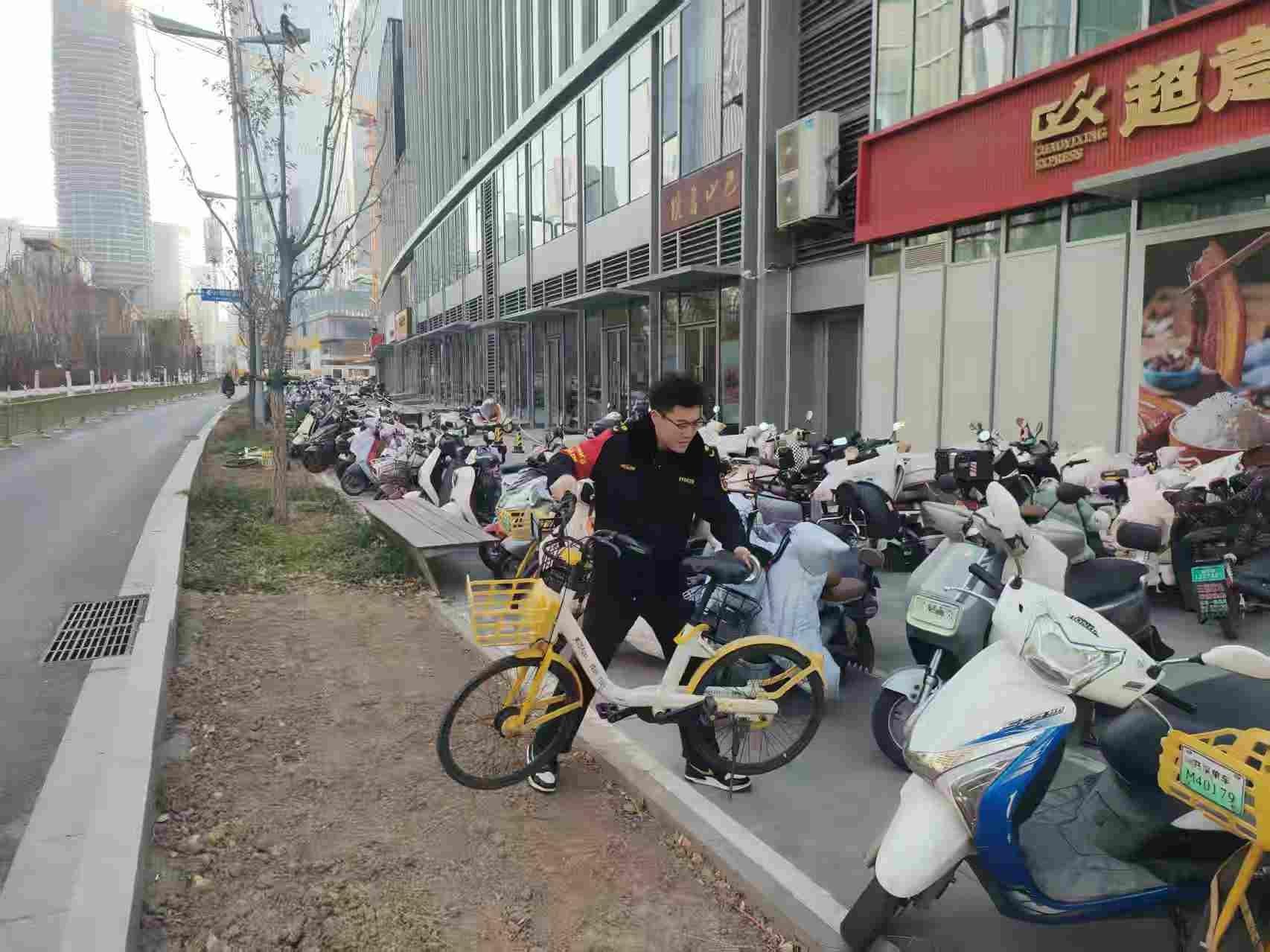 7-9 点的早高峰是一天中最忙碌的时段。“师傅,这边不能停,前面50米有专门的停车区!” 杨林快步上前,对停在非机动车道上的车辆进行劝离。他坦言,机动车及非机动车违停现象,极易造成交通事故,曾一度成为CBD治理最棘手的问题。对于乱停乱放的非机动车,网格员会将其挪移到以隔离带、黄金护栏等划分的新增停车区内,确保车头朝向一致;对于机动车则以劝离为主,遇到联系不上车主的情况,网格员会在车头放置提醒卡片,拍照上传,或扫描路旁的违停举报二维码上报给交警,车主那边能马上收到提醒信息。