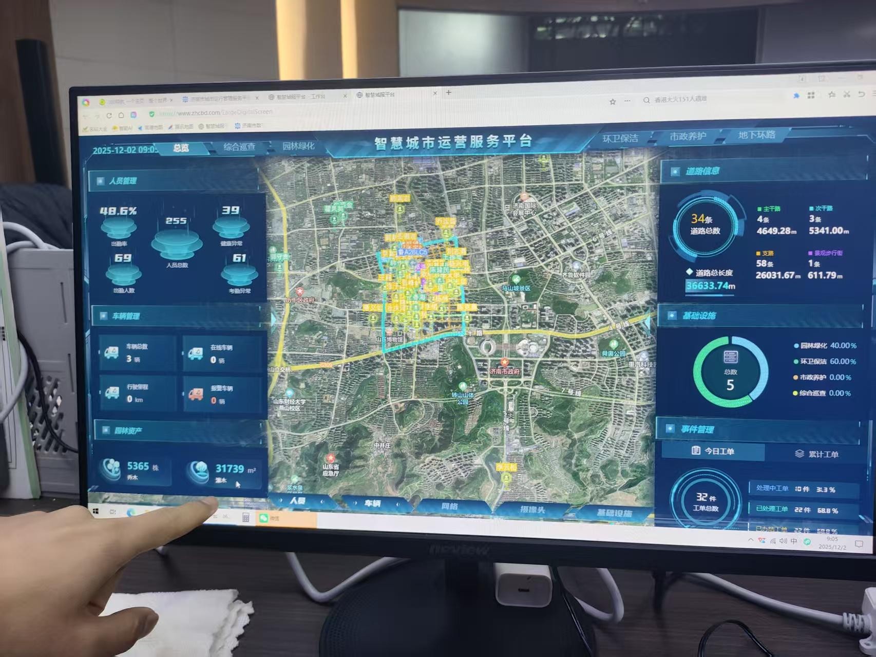 王云超指着平台上的“今日工单”板块介绍:“现在智慧平台还能联动智能手表——网格员佩戴的设备,既能实时定位,还能监测心率、体温等指标,随时反映身体状态,相当于给每人配了个‘随身健康助手’。遇到问题直接拍照上传,市政、环卫等部门10分钟就能响应。”在“智慧城市运营服务平台”的总览界面,还能实时查看到“人员出勤率”“巡查车辆”“道路信息”等数据,实现治理全流程可视化,监督起来也更方便。