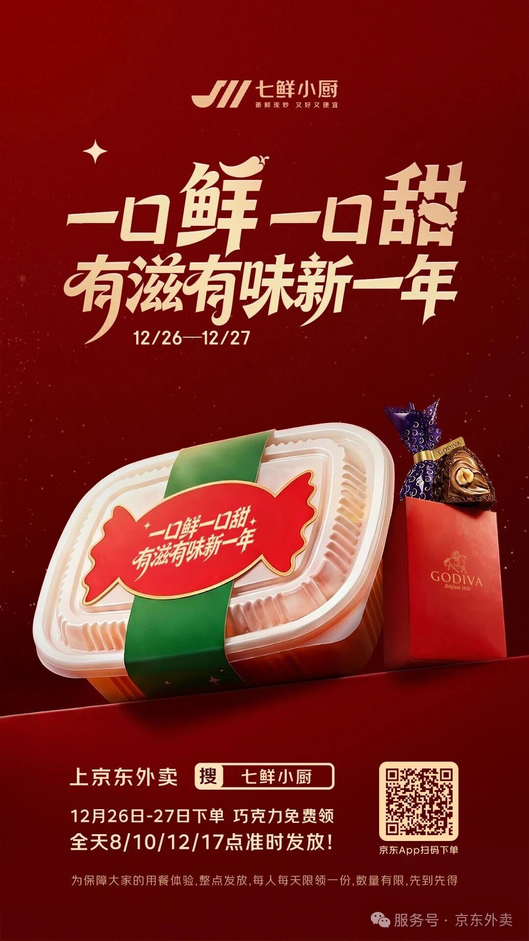 为保证大家的用餐体验,12月26日-27日下单七鲜小厨,巧克力免费领,全天8/10/12/17点准时发放!