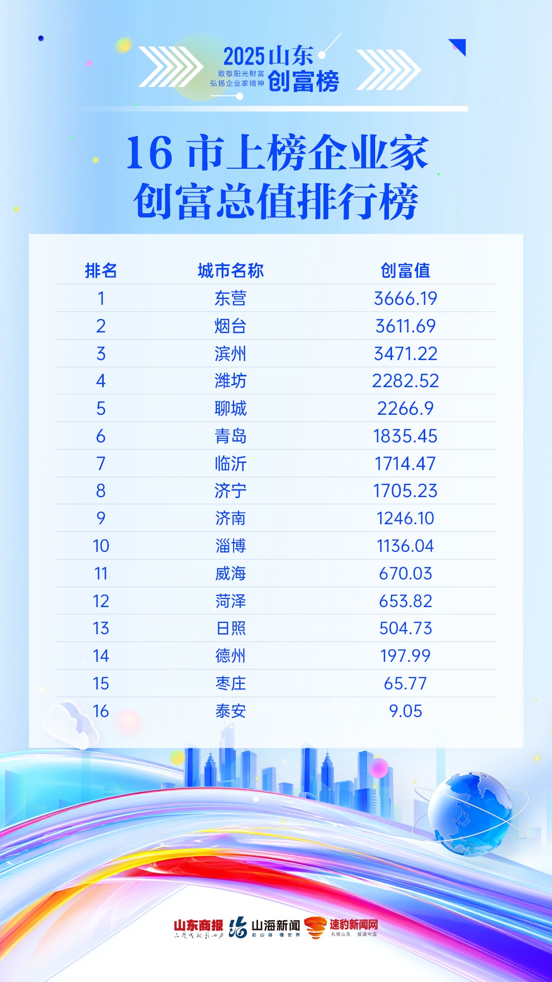 从16地市上榜企业家创富总值来看,创富值最高的三个城市分别是东营(3666.19亿元)、烟台(3611.69亿元)、滨州(3471.22亿元,紧随其后的是潍坊(2282.52亿元)、聊城(2266.9亿元)、青岛(1835.45亿元)、临沂(1714.47亿元)、济宁(1705.23亿元)、济南(1246.1亿元)、淄博(1136.04亿元)、威海(670.03亿元)、菏泽(653.82亿元)、日照(504.73亿元)、德州(197.99亿元)、枣庄(65.77亿元)、泰安(9.05亿元)。