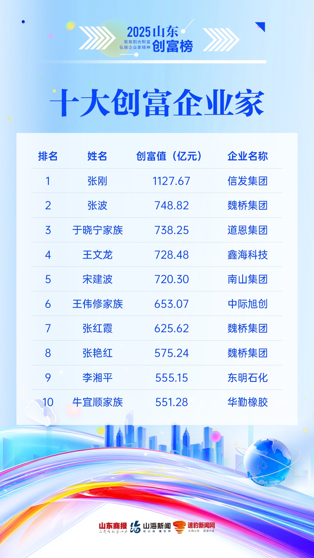今年的十大创富企业家分别是信发集团张刚(1127.67亿元)、魏桥集团张波(748.82亿元)、道恩集团于晓宁家族(738.25亿元)、鑫海科技王文龙(728.48亿元)、南山集团宋建波(720.3亿元)、中际旭创王伟修家族(653.07亿元)、魏桥集团张红霞(625.62亿元)、魏桥集团的张艳红(575.24亿元)、东明石化李湘平(555.15亿元)以及华勤橡胶牛宜顺家族(551.28亿元)。