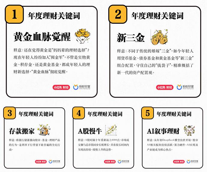2025年,存款利率步入“0字头”,金价屡创新高,大众理财意识正经历深刻转变。近日,蚂蚁财富与小红书联合发起年度理财关键词投票,由2万多名网友票选出了五大关键词:黄金血脉觉醒、新三金、存款搬家、A股慢牛和AI叙事理财。其中,黄金关键词占据了两席。