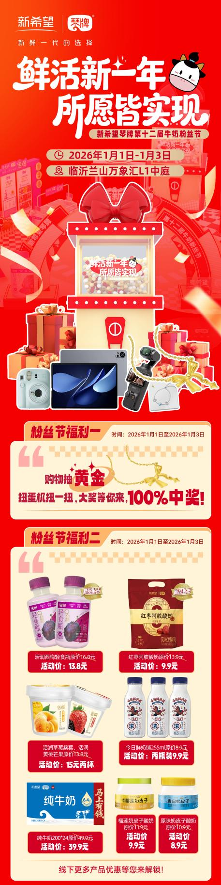 与此同时,新希望琴牌第十二届粉丝节活动将在临沂兰山万象汇上演。1.1-1.3元旦假期,新希望琴牌牛奶走出青岛,为临沂消费者带来新鲜健康的产品与快乐幸运的双重体验。在此次活动中,不仅可以购买到新上市的活润紫色轻食瓶,它以一瓶甄选9种紫色超级果蔬,富含25g膳食纤维的超级卖点成为消费新宠。还有新品红枣阿胶大包酸奶、奶皮子酸奶、今日鲜奶铺等众多明星产品亮相。凡在现场购买琴牌牛奶的消费者都有机会赢得黄金饰品、电子设备等好礼。消费者参与小红书互动也可转动好运扭蛋机,赢得大奖……一系列诚意满满的趣味互动,给予粉丝们欢乐和前行的力量,奔向新一年。