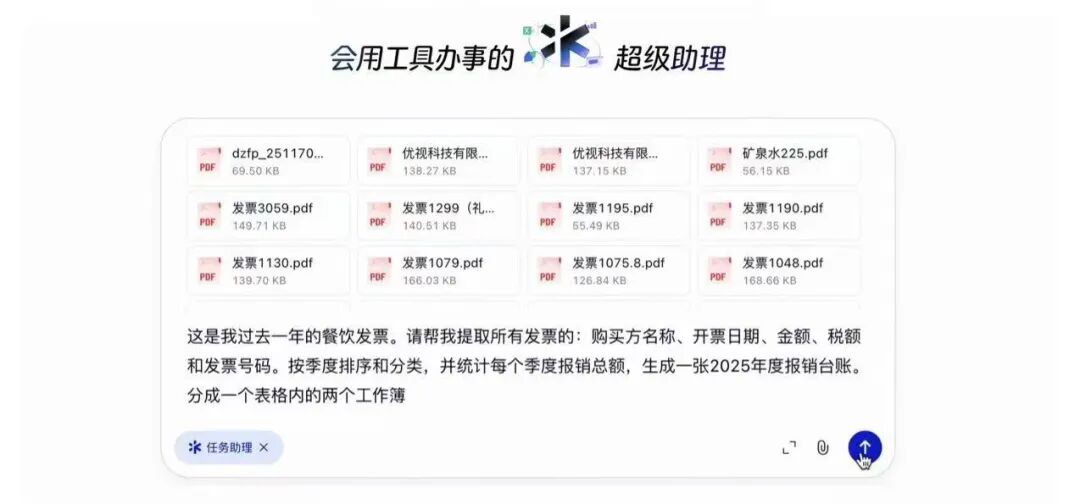 “以前年底处理报销,员工提交的上百张发票要逐张核对抬头、金额、开票日期,手动录入Excel还总担心出错,光整理台账就耗掉大半天。”某机械公司财务工作人员李女士的抱怨道出了无数职场人的痛点,在工作场景中,大量精力耗费在重复性数据录入上。而现在,只需将所有发票拖入千问任务助理,输入“生成年度报销台账”,系统便自动识别关键信息,几分钟内即可输出结构清晰的标准化表格,精准统计数据。