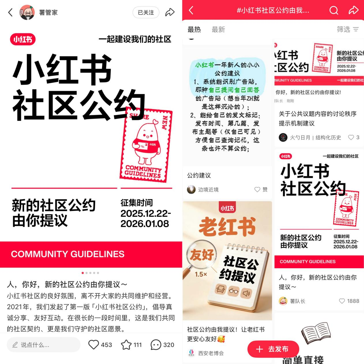 (小红书社区提前征集用户的反馈,发起了话题征集活动#小红书社区公约由我提议)