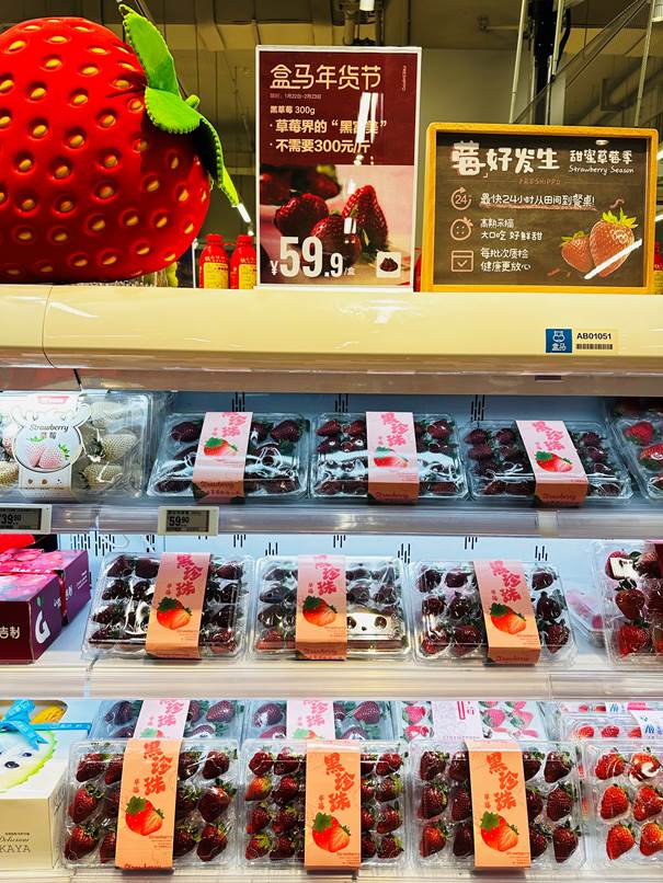 盒马相关采购负责人弥乐介绍,盒马三年前开始小规模销售“黑珍珠草莓”,销售规模逐年递增,价格相比往年有所下探。但相比常规大通品种,目前仍主要满足于“猎奇、送礼、社交、分享”等中高端体验型消费。