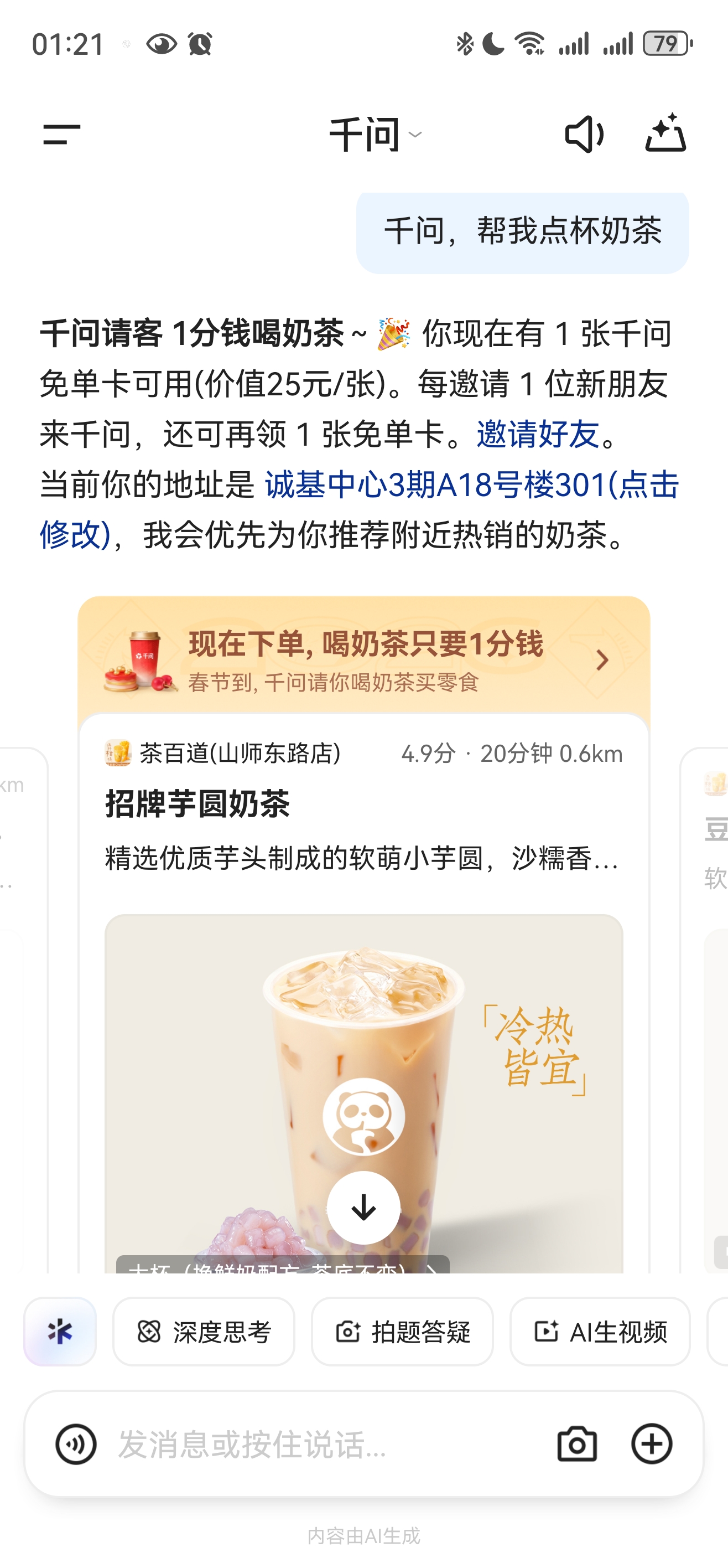 所有用户更新千问APP后,都能白拿一张25元无门槛免单卡,不仅能免单喝奶茶,也能通过淘宝闪购买年货、点外卖。