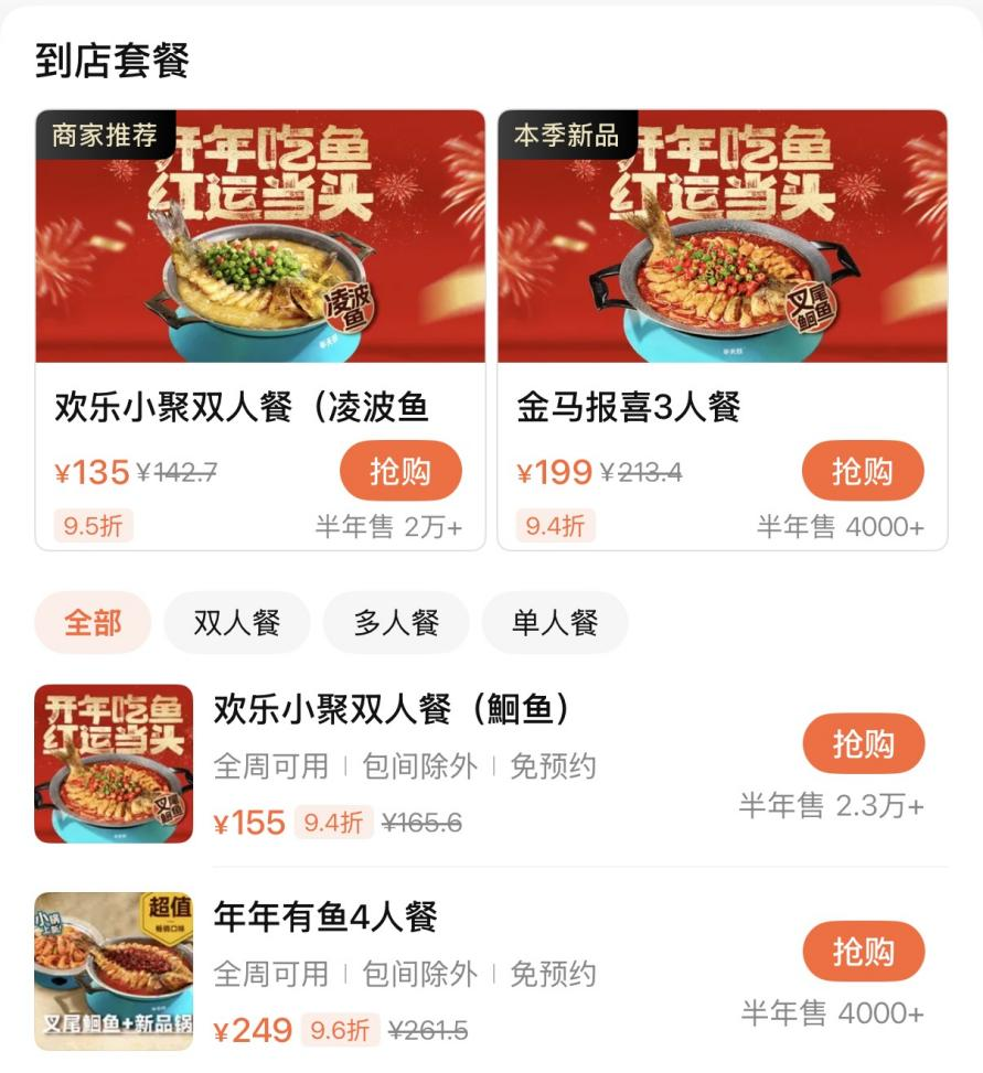 半天妖烤鱼相关负责人向记者透露,针对这一新消费趋势,品牌在北京、上海等城市核心商圈的部分门店提前布局,推出马年新春专属节日套餐,上线换欢乐小聚双人餐、金马报喜3人餐、年年有鱼4人餐等多档位套餐,覆盖朋友小聚、家庭团圆等不同场景。