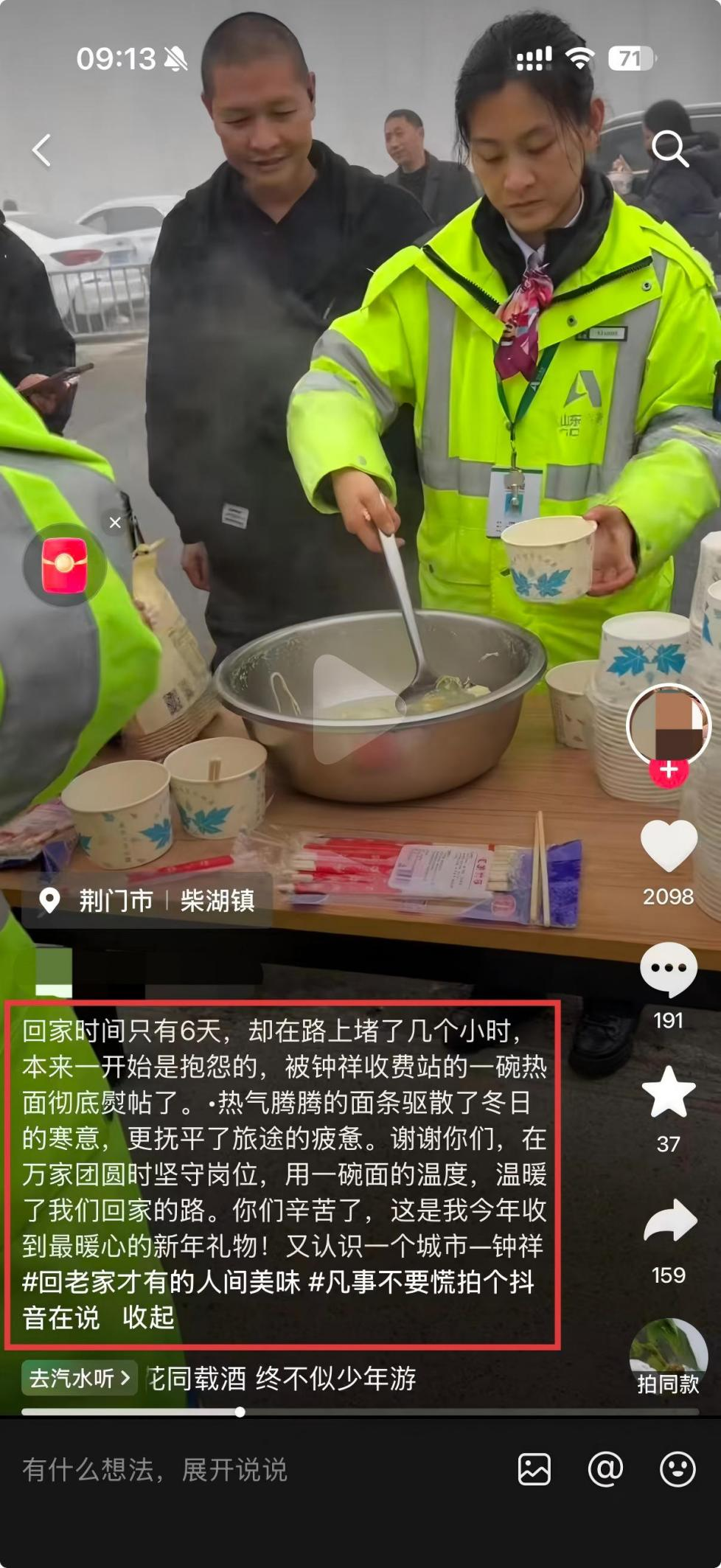 一位上海籍司机也在网上留言,字里行间满是真诚的谢意:“回家时间只有6天,却在路上堵了几个小时,本来一开始是抱怨的,被钟祥收费站的一碗热面彻底熨帖了。热气腾腾的面条驱散了冬日的寒意,更抚平了旅途的疲惫。谢谢你们,在万家团圆时坚守岗位用一碗面的温度,温暖了我们回家的路,你们辛苦了,这是我今年收到最暖心的新年礼物!”