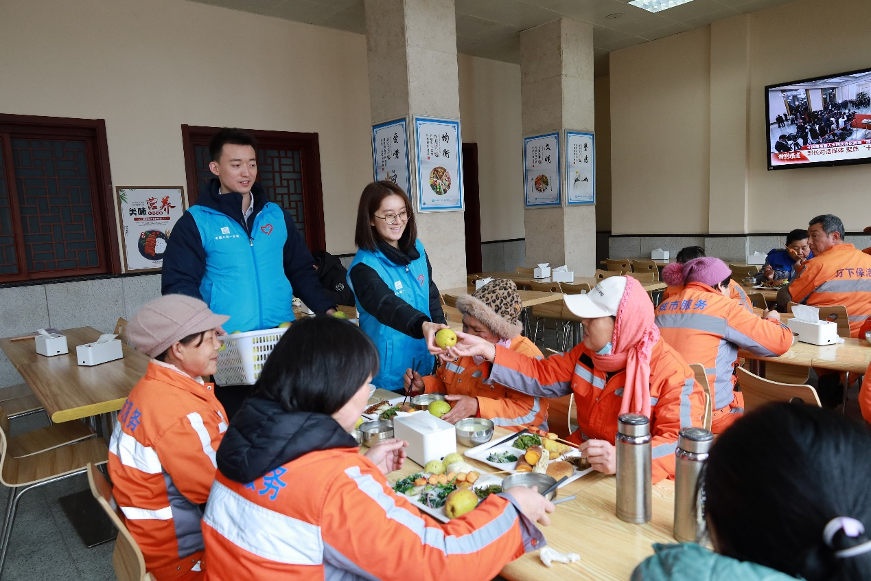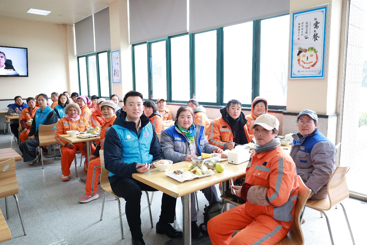 清扫工作结束后,志愿者们邀请环卫工人走进食堂,为他们准备了热腾腾的爱心午餐,用餐结束后为他们送上卫生纸、洗衣液等生活用品,将央企的关怀与温暖送到一线劳动者手中。