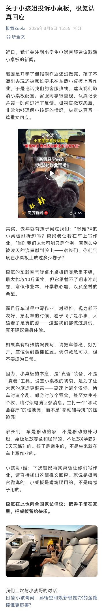 “设置小桌板的初衷,是为了让大家的旅途更惬意——高速上啃个汉堡、堵车时追个剧、郊游时放个零食,甚至女生补个妆、临时架电脑回条消息。主打一个‘移动会客厅’的松弛感,而不是‘移动辅导班’的压迫感。”极氪方面倡议家长们,“车是移动的家,不是移动的补习班。小桌板是啃鸡腿用的,不是啃卷子用的。”