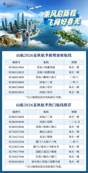 2026年夏秋航季,山航将持续优化航线网络、提升服务品质,助力旅客畅行全国、联通世界。查询航班信息或预订机票,欢迎登录山航官网(www.sda.cn)、下载山东航空APP或使用山航官方小程序,如需咨询可拨打山航24小时客服热线95369。