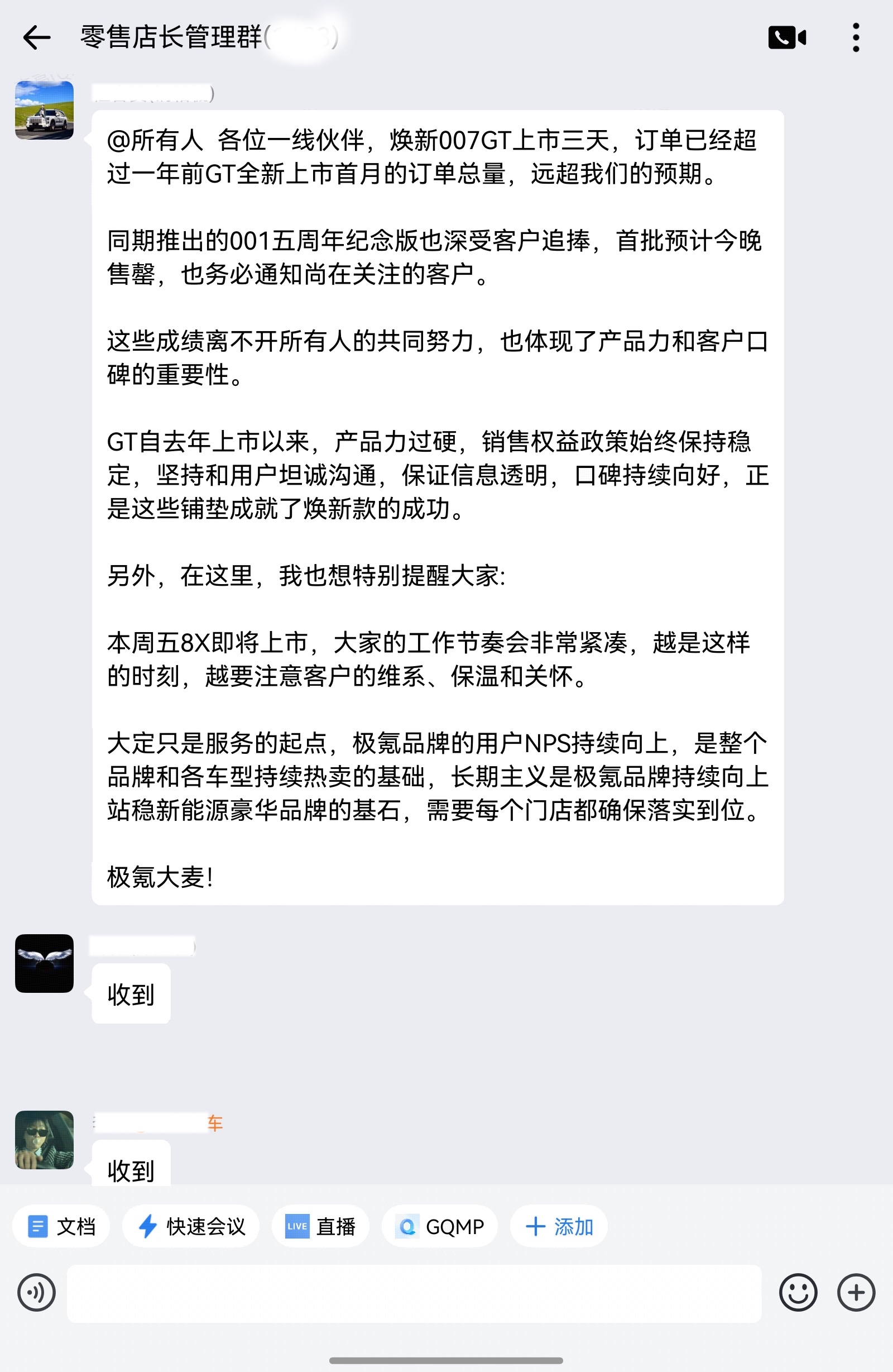 4月13日,知情人士从内部获悉,极氪焕新7系的订单超出预期。内部销售群聊记录显示,上市仅3天,焕新007GT订单已超一年前老款车型上市首月的订单总量。同期推出的极氪001五周年纪念版同样火爆,首批车型预计即将售罄。