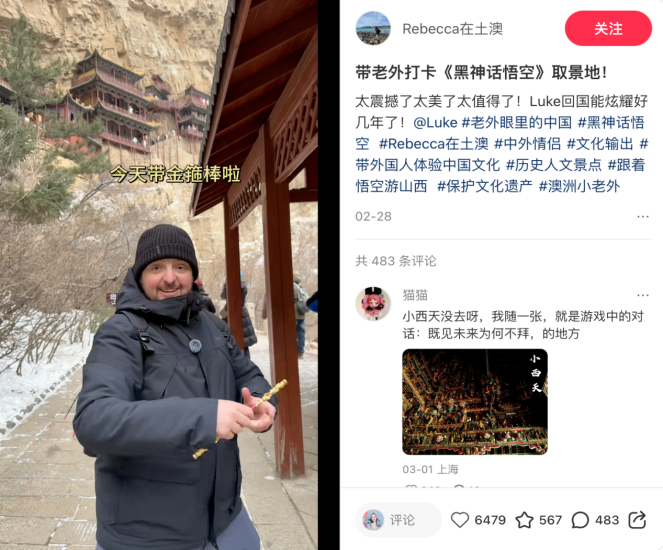吸引他们深入探索的,有时是兴趣——被黑神话悟空吸引到山西看古建,为了体验中式公主王子的一天而去河南。俄罗斯姑娘@Anastasia 带痴迷中国古装剧的妈妈去横店实地圆梦,妈妈高兴到流泪。另一些城市,因为独一无二的风貌或体验,被外国游客熟知。贵阳在韩国游客眼中,是多了民族风情和壮美山水的首尔“贵”替,又被欧美游客标记为素食主义者的天堂。