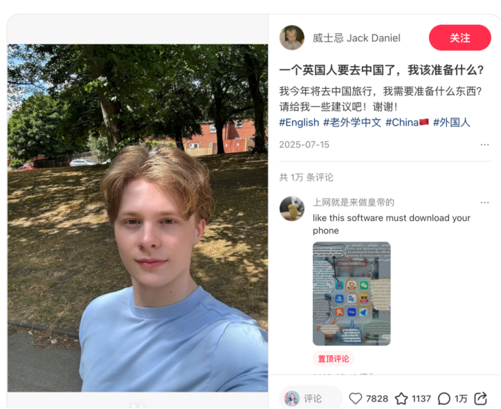 英国网友Jack Daniel 出发前发笔记询问一个人来中国的建议,收获上万条评论,具体到如何找厕所、如何防晒、如何提前线上购物等,应有尽有,评论比点赞还多,而这已成为外国游客求助笔记的常态。
