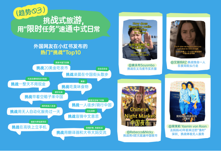 报告总结了小红书上外国朋友发布最多的10种挑战。有关于日常生活的,如:挑战20美元吃遍夜市、挑战带着空箱子来中国、挑战用翻译器和广场舞大爷大妈交流;有关于高新科技的,如挑战用无人服务过一天、挑战不用现金过一天;也有关于安全感的,如挑战凌晨在中国街头散步。