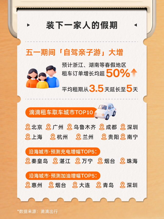 租车市场同步升温——滴滴租车预订量较去年同期上涨30%,超过一半订单来自新用户,取车城市Top10依次是:北京、广州、乌鲁木齐、成都、深圳、上海、杭州、兰州、贵阳、南宁。半数用户选择新能源车型,达去年同期2.1倍。