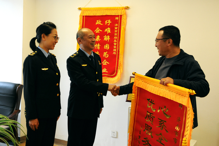 “新订单已经发出,特别感谢市场监管部门的指导。”韦先生是济阳区一家乳制品生产企业的相关负责人,他一早赶来为市市场监管局送上一面锦旗。