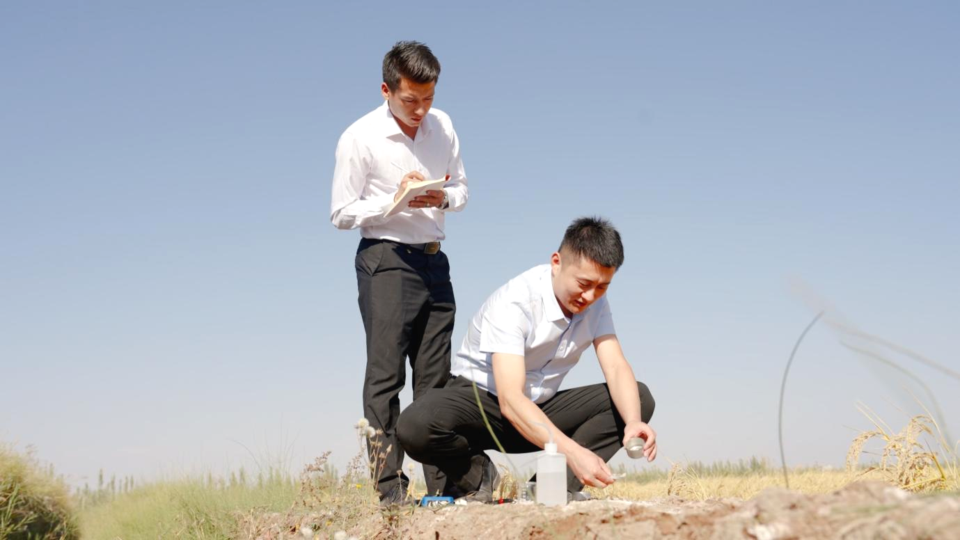 平安专员与技术人员在田间检测土壤场景