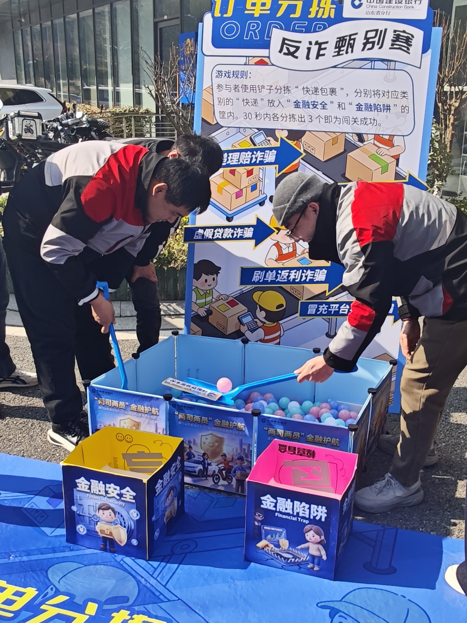 在外场活动区域设置了主题宣传入场门、特色拍照打卡墙、金融知识科普展板及车辆装饰区,营造出浓厚的宣教氛围。参与者走进活动入场门,在主题墙打卡留影后,纷纷将印有3·15金融教育宣传口号的小旗、贴纸等装饰到外卖车上,打造了一辆辆“消保宣传车”,在大街小巷形成了一道道流动的风景线。活动现场参与者沉浸式参与两款量身定制的互动游戏:“订单分拣-反诈甄别赛” 模拟快递包裹分拣场景,将快递理赔诈骗、虚假贷款、刷单返利、冒充平台客服等高频骗局融入游戏环节,参与者需在规定时间内将“非法陷阱”与“合法权益”精准分类,在趣味游戏中快速掌握反诈识别技巧。“骑行抢飞单” 游戏结合骑行、驾驶工作场景,以飞盘投掷、金融知识答题的形式,普及断卡行动、不出租出借银行卡等核心金融权益知识,让大家在轻松互动中牢记金融安全底线。
