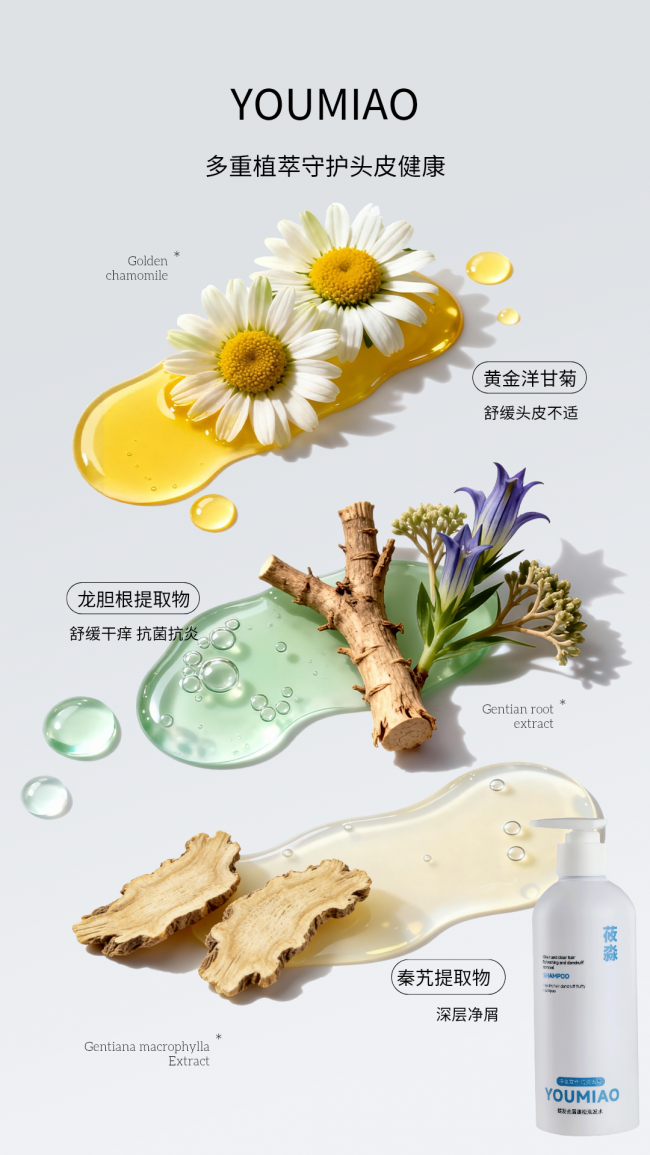 在成分搭配上,莜淼洗发水摒弃无效成分堆砌,复配龙胆根、侧柏叶、金黄洋甘菊、麦冬、金钗石斛、油橄榄果油、獐牙菜、秦艽、泛醇等多种天然植萃与营养成分,构建全方位的头皮与发丝养护体系。其中,龙胆根、金黄洋甘菊、秦艽提取物协同作用,能有效抗炎舒缓,缓解头皮泛红、瘙痒不适,温和呵护头皮;侧柏叶、獐牙菜提取物则专注调节头皮水油平衡,减少油脂堆积,实现长效控油,解决头皮油腻闷肤的问题;麦冬、金钗石斛提取物与泛醇深度滋养毛囊,为发根输送充足营养,增强发丝韧性,减少断发掉发,实现养发健发、强韧发根的效果;油橄榄果油则能锁住头皮与发丝水分,改善发丝干枯毛躁,让发丝保持柔软顺滑。
