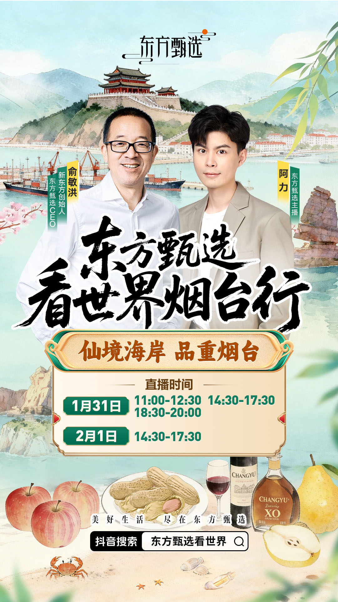 近日,东方甄选官方公布,俞敏洪、主播阿力将于1月31日至2月1日走进山东烟台,沉浸式体验、解锁烟台的山海浪漫与人间烟火。并通过东方甄选A